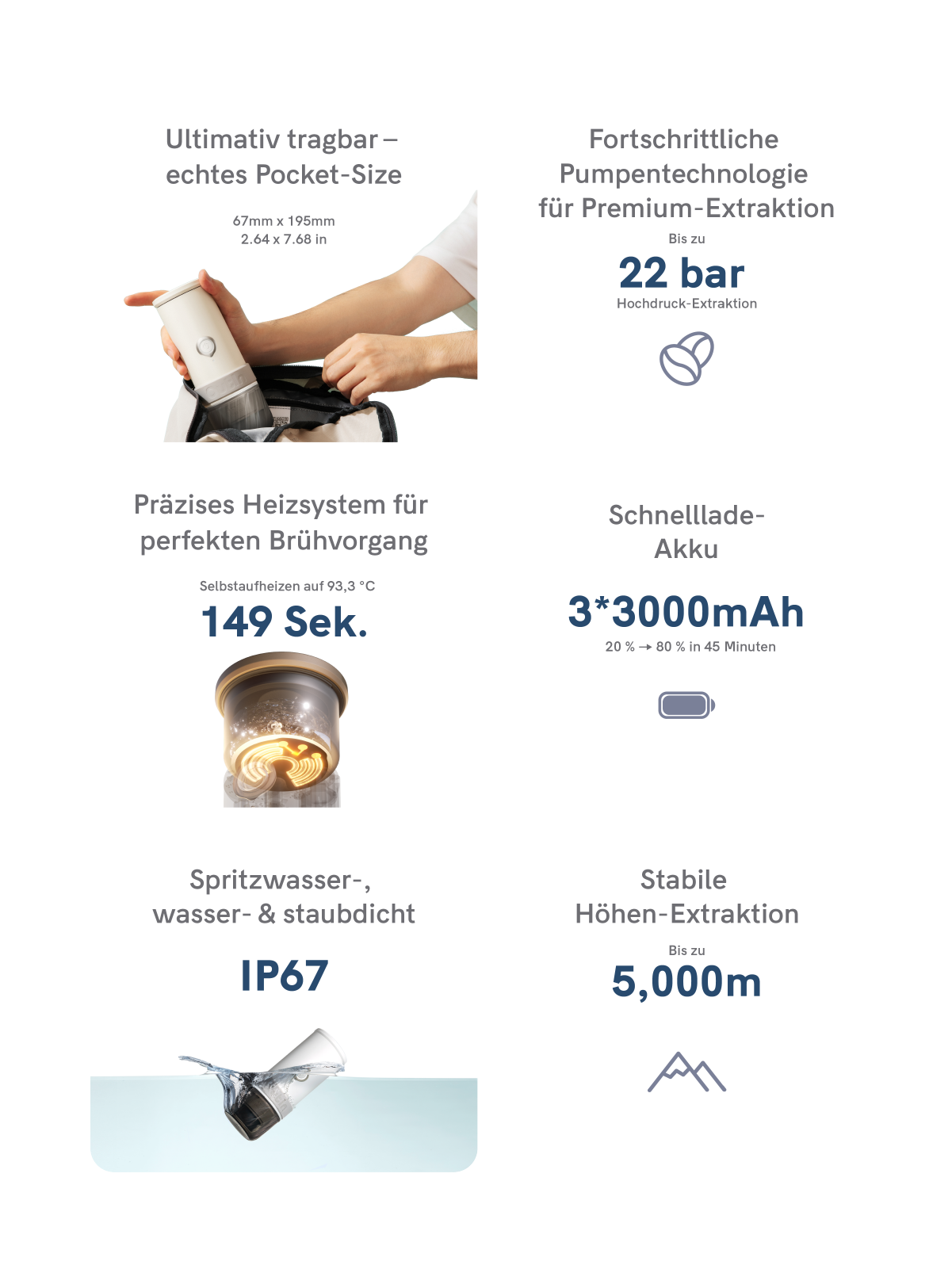 Ein leistungsstarker 3*3000-mAh-Akku liefert mehr Tassen pro Ladung. Mit USB-C-Schnellladung erreichen Sie von 20 % auf 80 % in 45 Minuten und volle Power in ca. 100 Minuten.