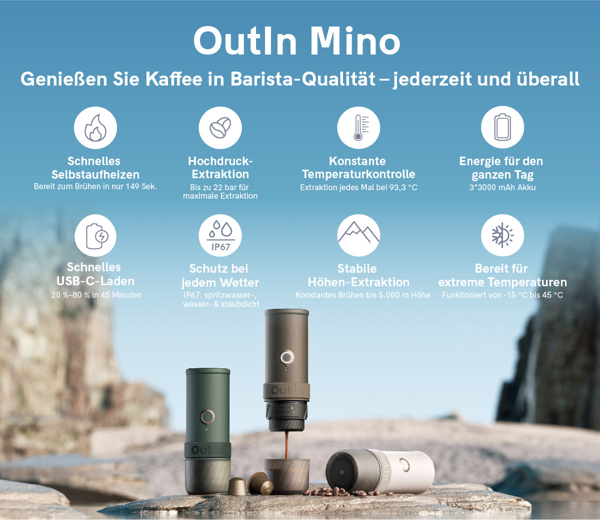 Für Entdecker, die den Sonnenaufgang auf Berggipfeln oder den Sonnenuntergang in endlosen Wüsten erleben – dieser Kaffee-Begleiter ist immer dabei. Ob Regen oder Sonne, Wind oder Ruhe: Ihr Kaffee bleibt konstant perfekt.