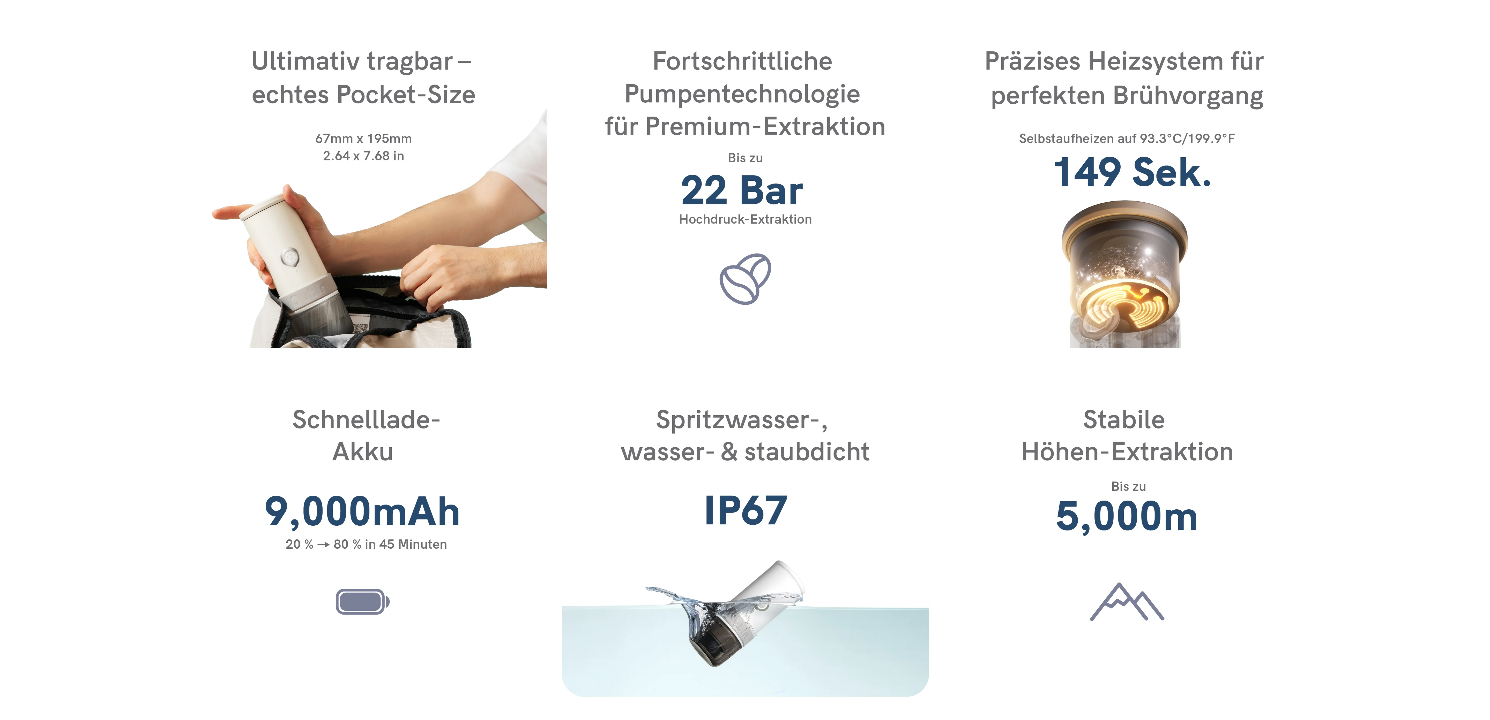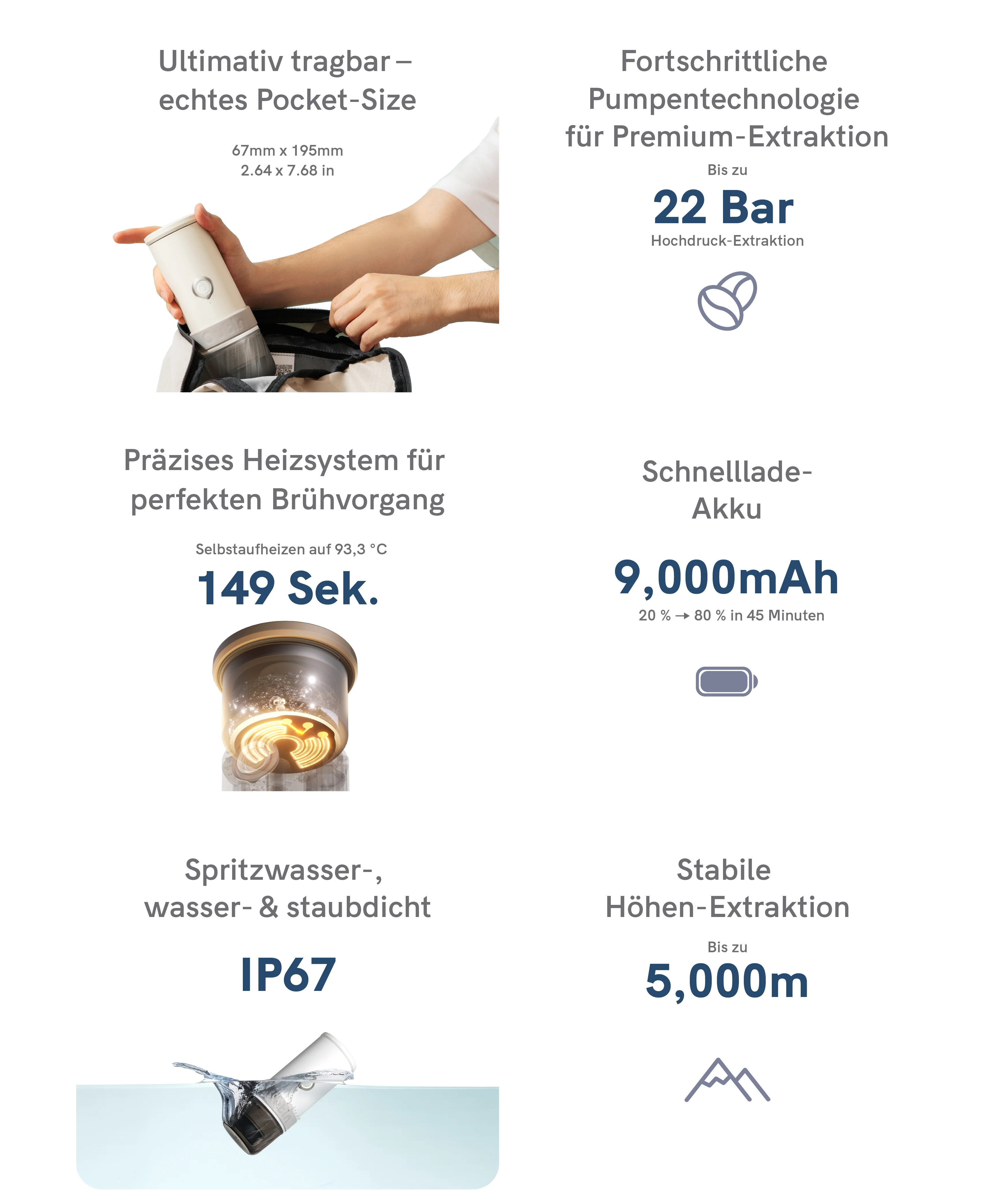 Ultimativ tragbar, echt Taschenformat: Mit kompakten Maßen von φ67mm x 195mm passt diese elektrische Espressomaschine in Ihren Rucksack oder Ihre Jackentasche – perfekt zum Wandern, Campen oder für jedes Abenteuer.