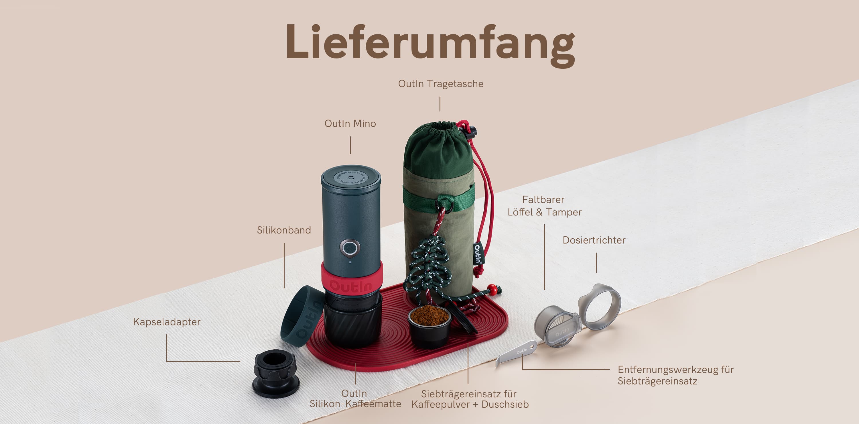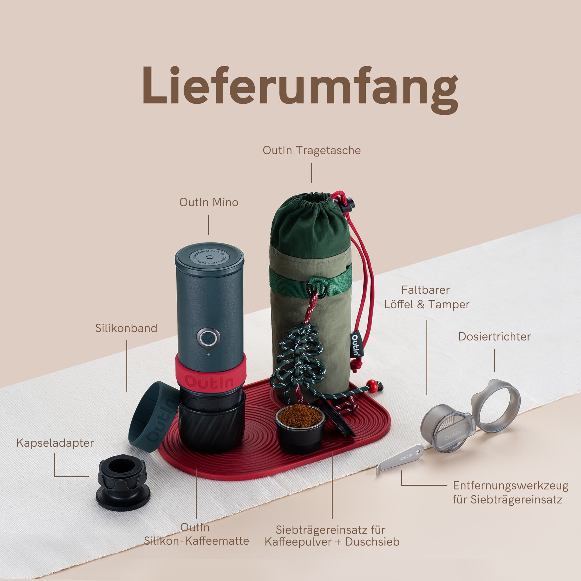 - Lieferumfang: OutIn Mino, Tragetasche, Silikon-Kaffeematte und sämtliches notwendiges Zubehör.