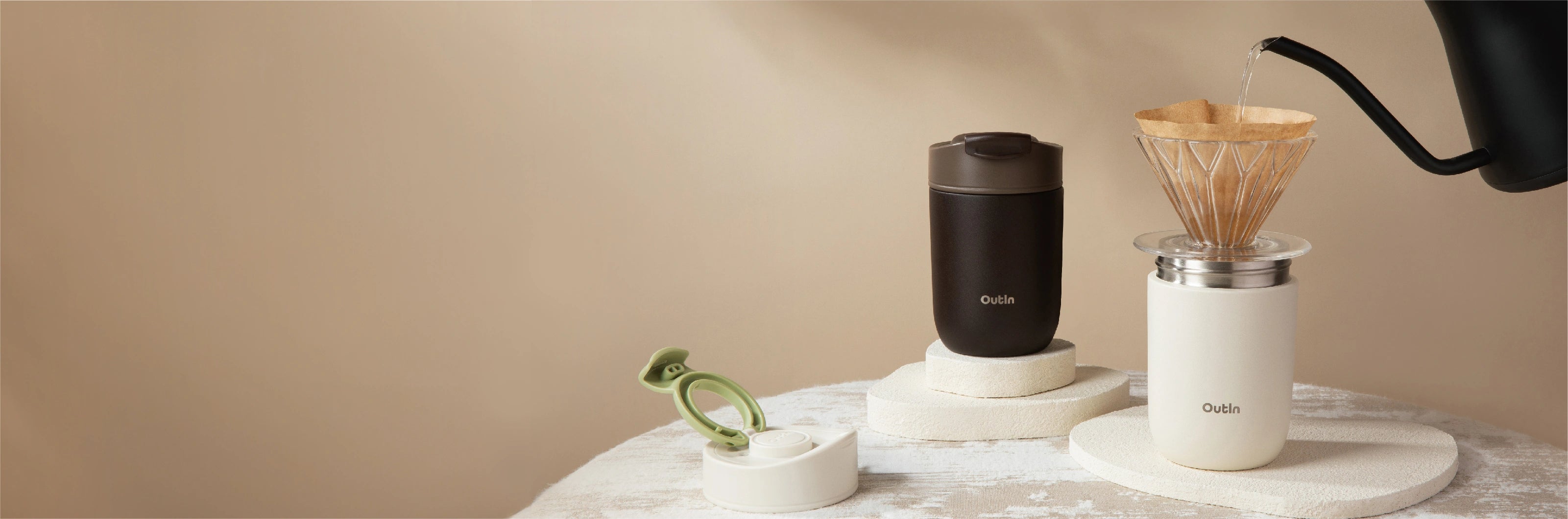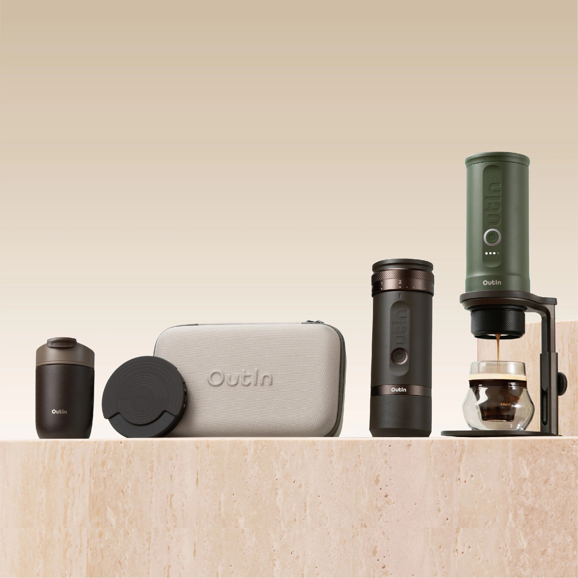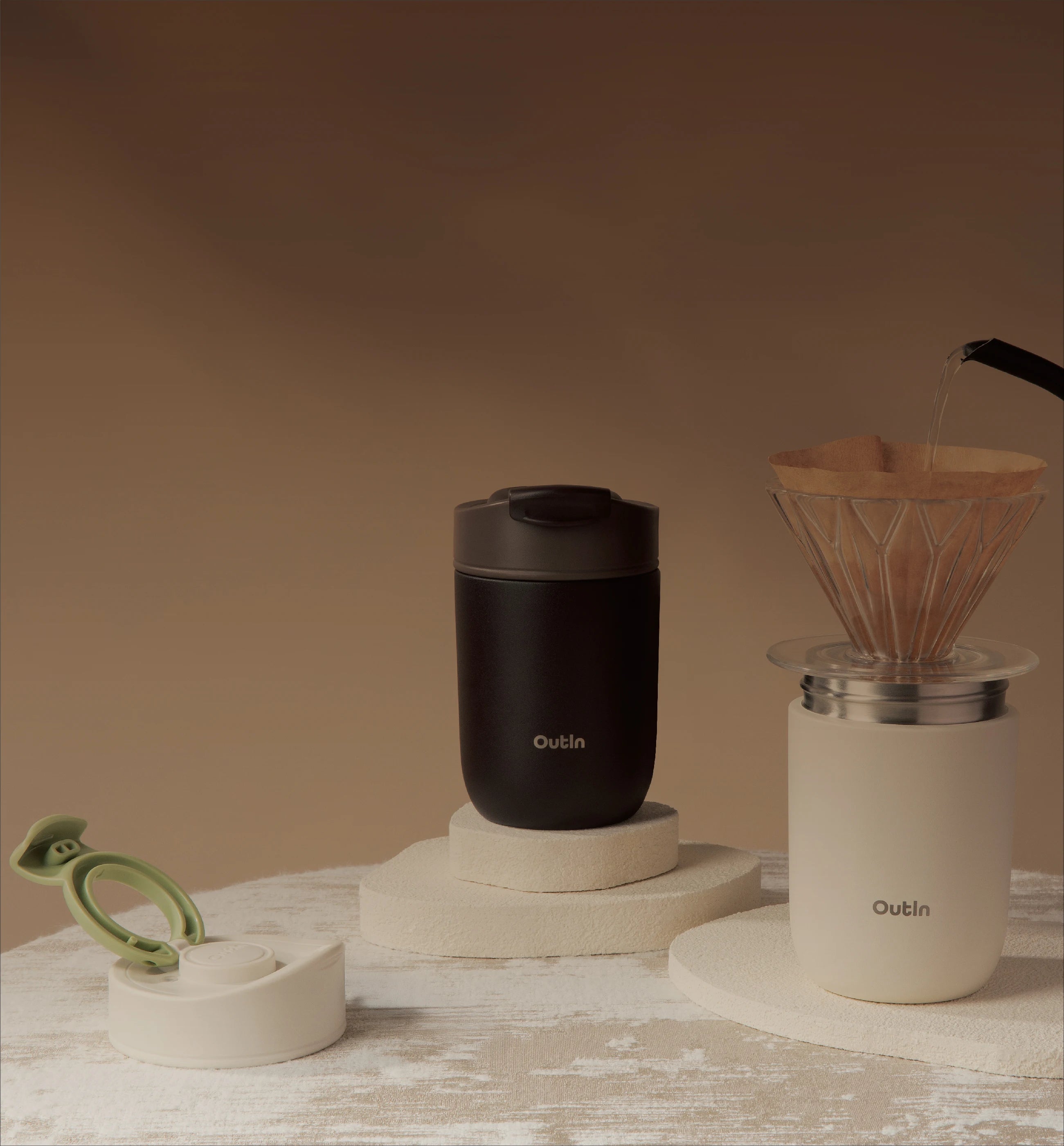 Kombinieren Sie den OutIn Reisebecher mit Ihrem OutIn Nano und dem Universeller Kaffeeständer – für das ultimative tragbare Kaffee-Setup.